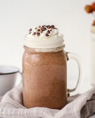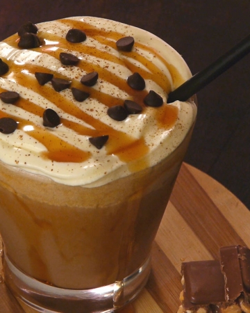 모카시럽과 자바칩이 혼합된 크림 프라푸치노로 휘핑크림, 초콜렛 드리즐된 음료.